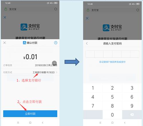 第四步:选择“微信支付“或者“支付宝”,点击去支付。输入对应的支付密码即可支付成功。